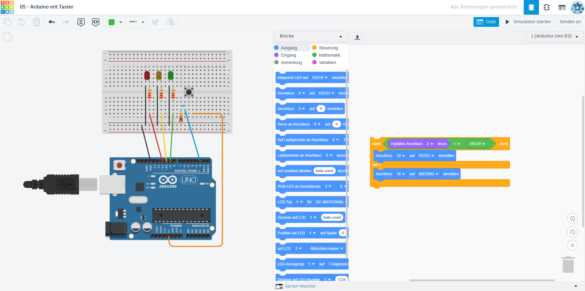 Am Tinkercad kanns du online Arduino-Schaltungen zeechnen, programméieren, a simuléieren.