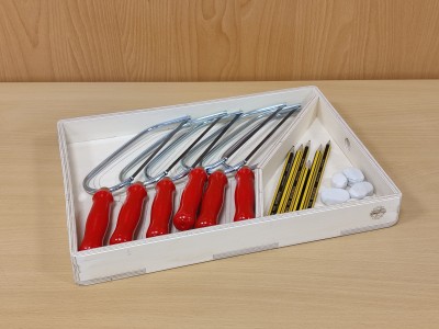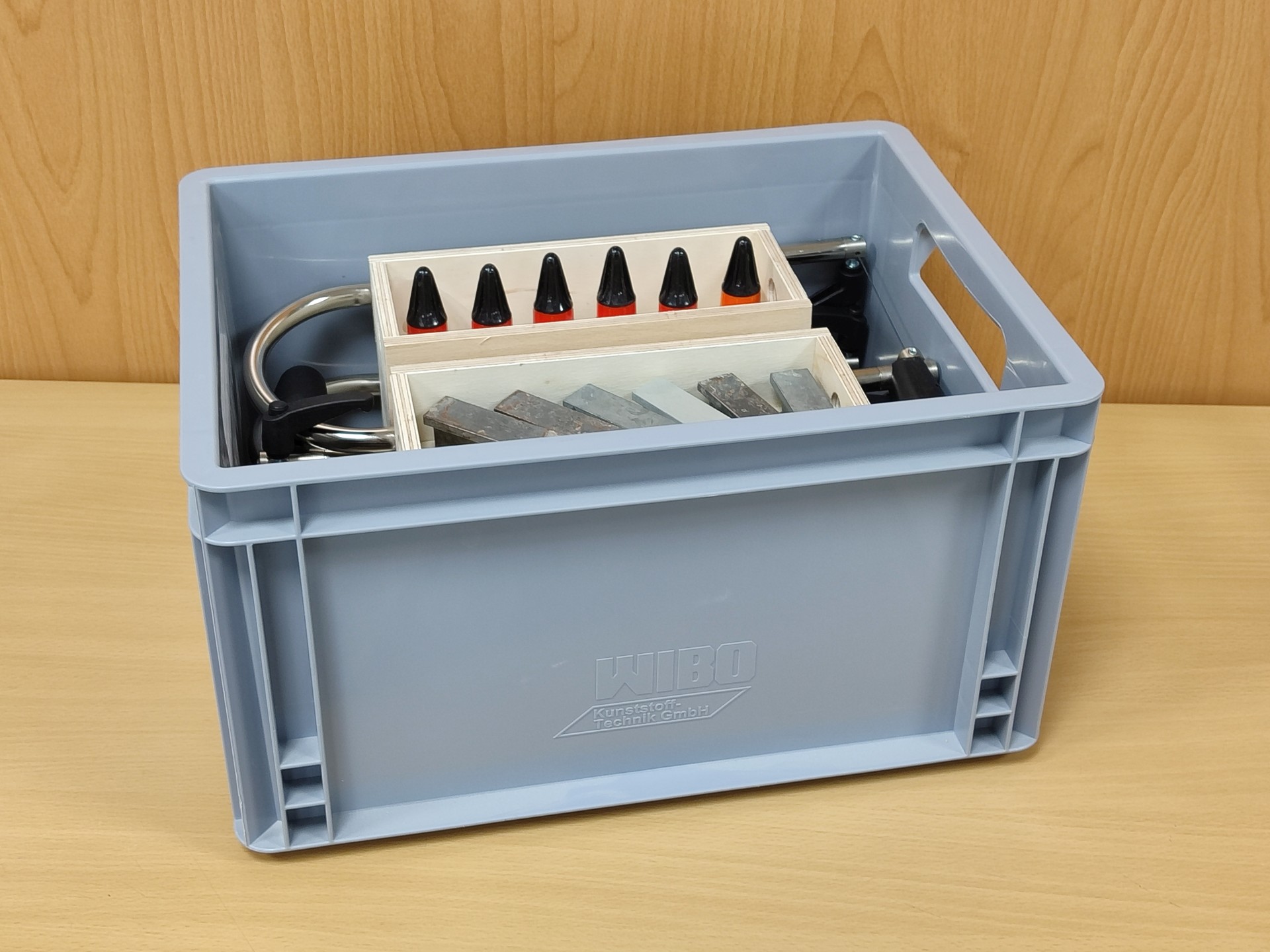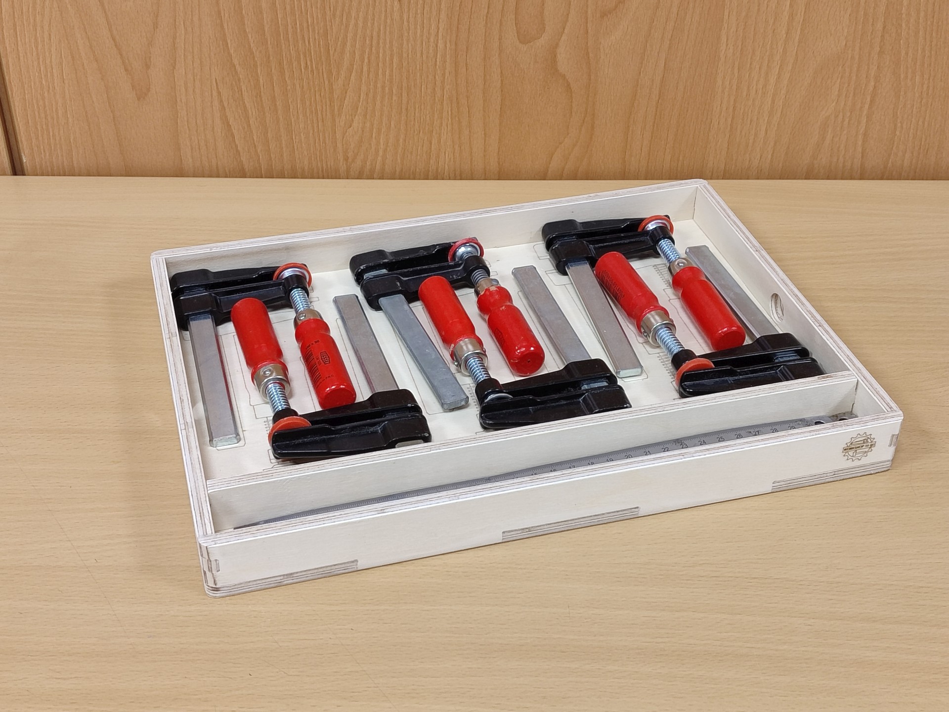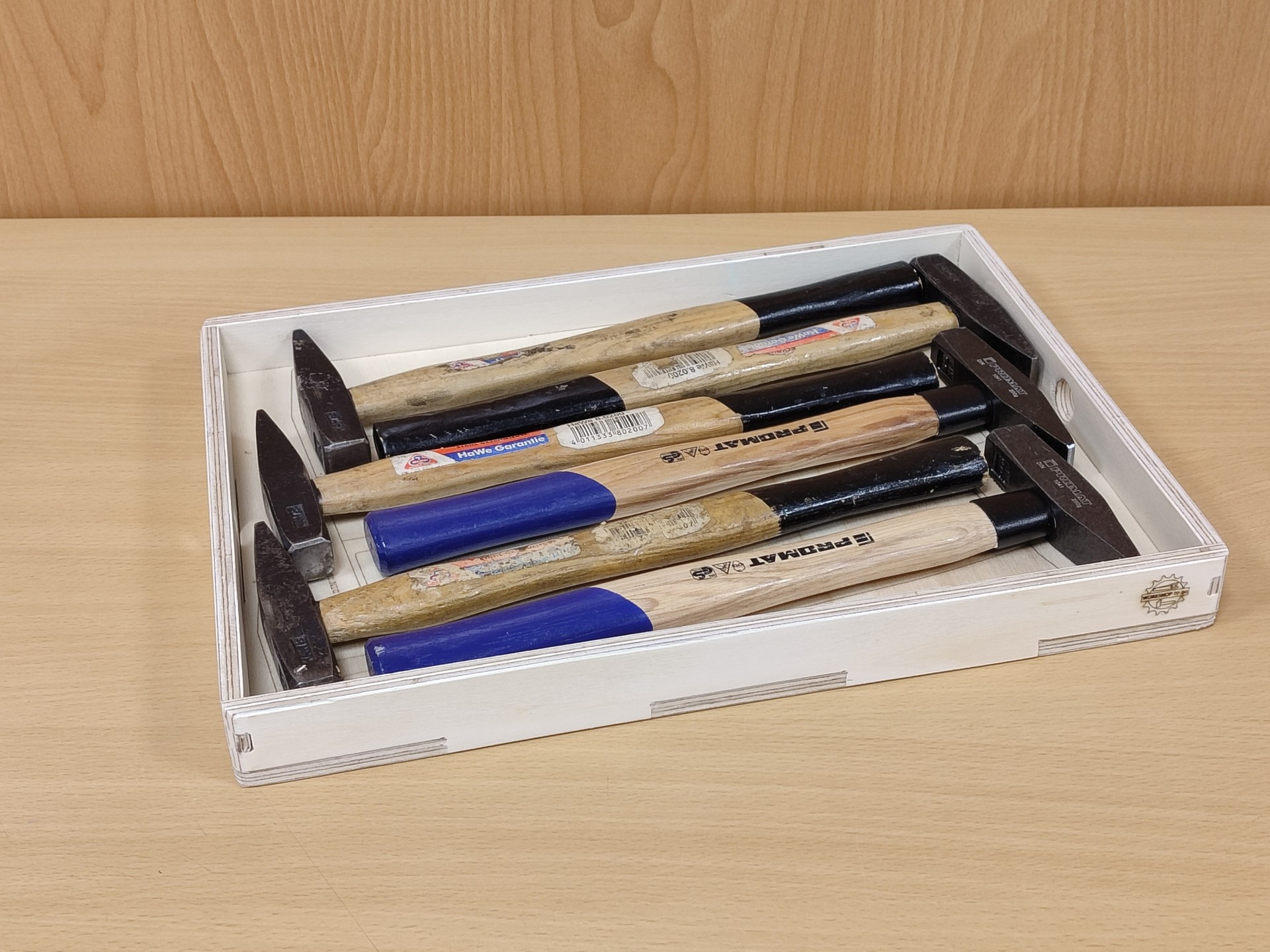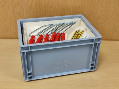 An déi zweet Normkëscht passe 6 Schräinerseeën, 6 Himmer, 6 zousätzlech Schraufzwéngen, 6 Metall-Linealer a 6 PUK-Seeën. A fräie Fächer kënnen z.B. Bläistëfter a Gummie geraumt ginn. Jee no Aktivitéit muss net all Plateau ausgepaakt ginn, a beim Raume gesäit een direkt, op all d'Geschier erëm op senger Plaz ass.