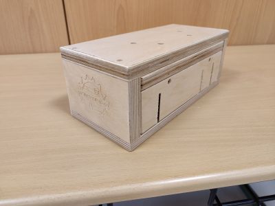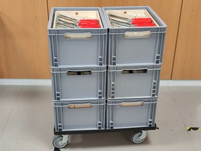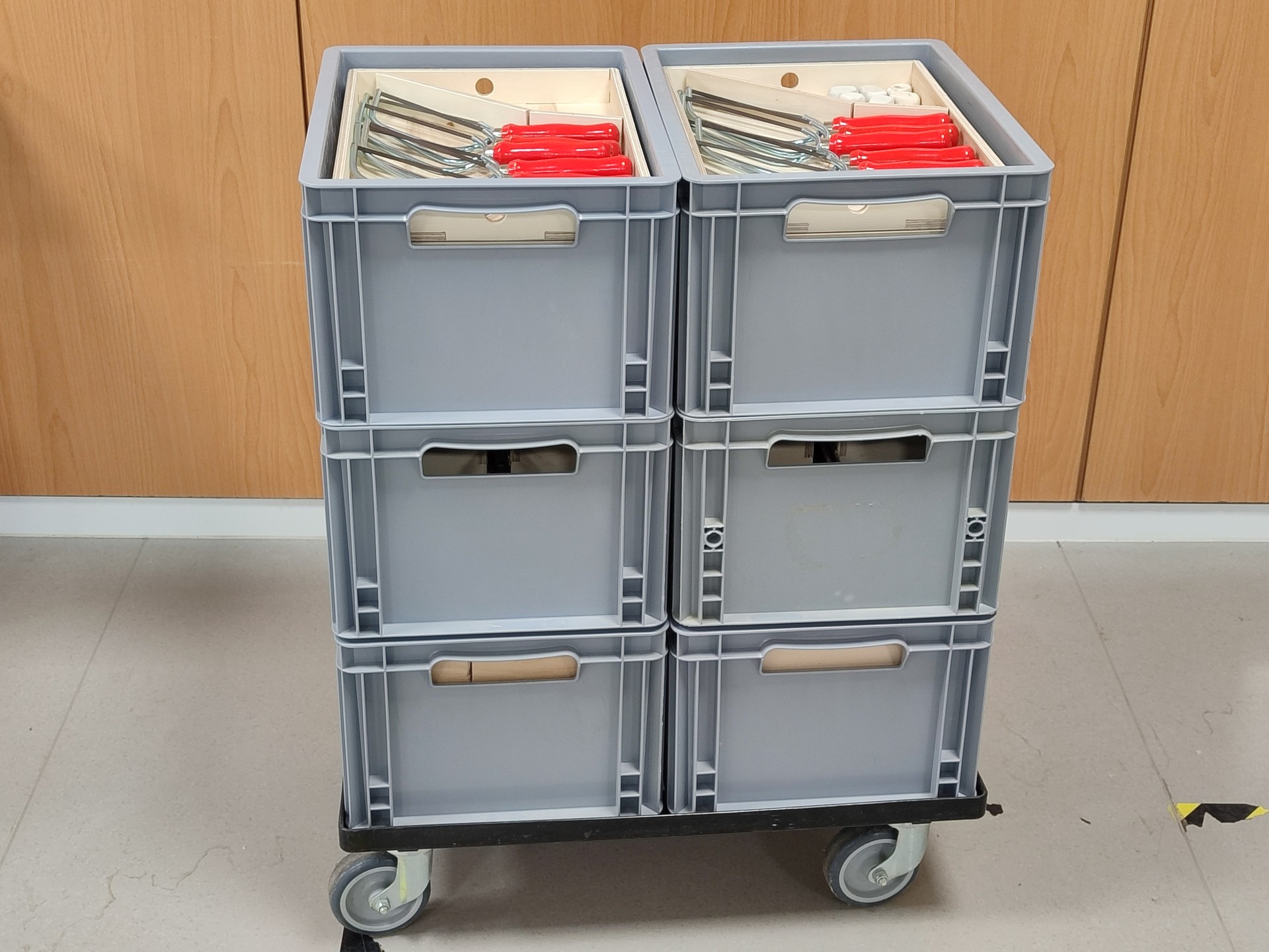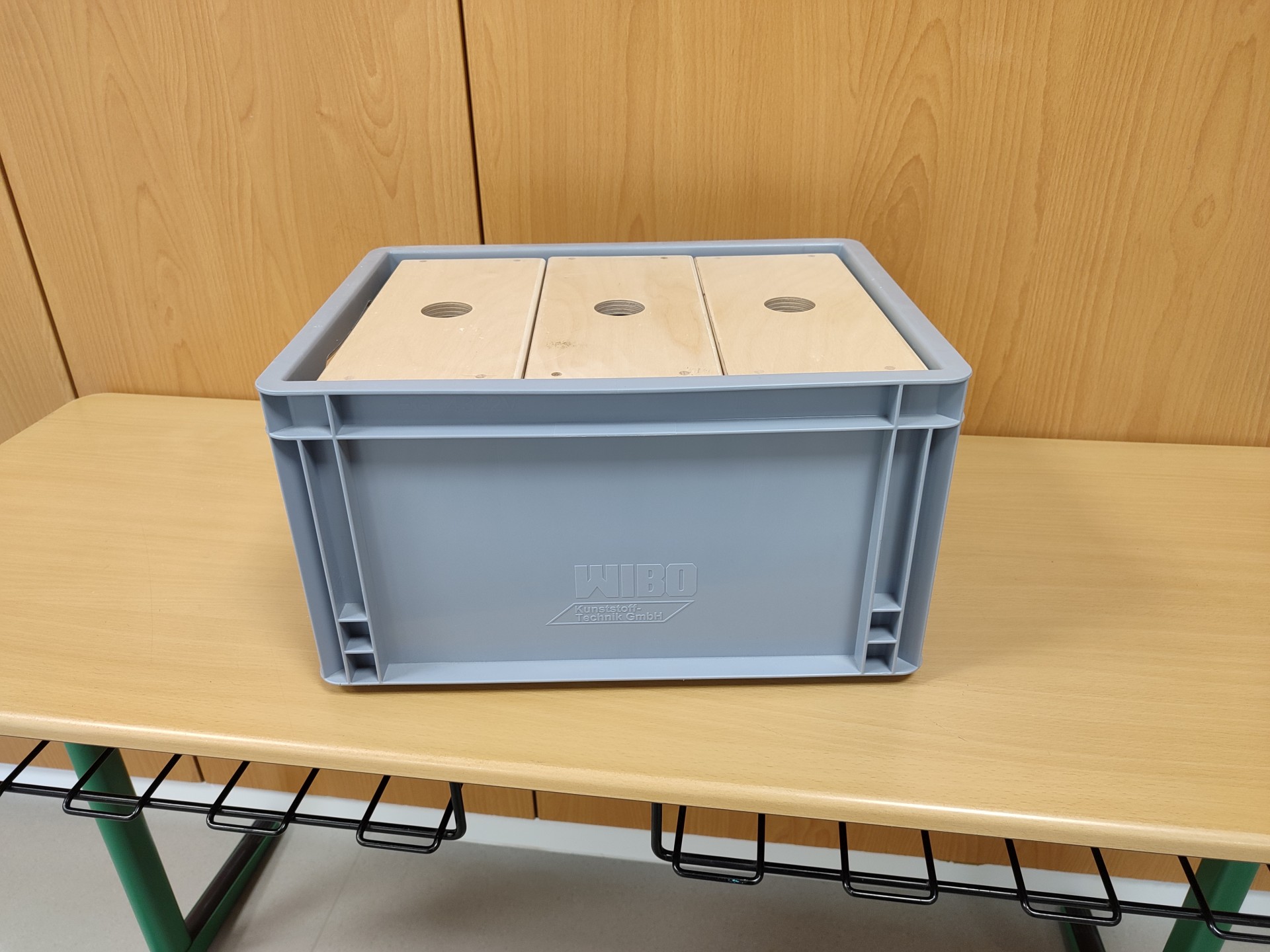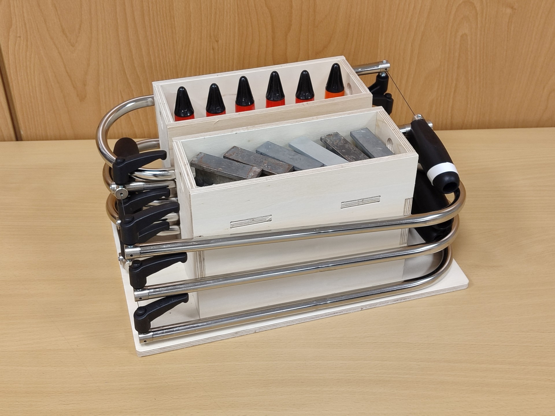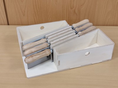 An déi zweet Normkëscht passe 6 Schräinerseeën, 6 Himmer, 6 zousätzlech Schraufzwéngen, 6 Metall-Linealer a 6 PUK-Seeën. A fräie Fächer kënnen z.B. Bläistëfter a Gummie geraumt ginn. Jee no Aktivitéit muss net all Plateau ausgepaakt ginn, a beim Raume gesäit een direkt, op all d'Geschier erëm op senger Plaz ass.