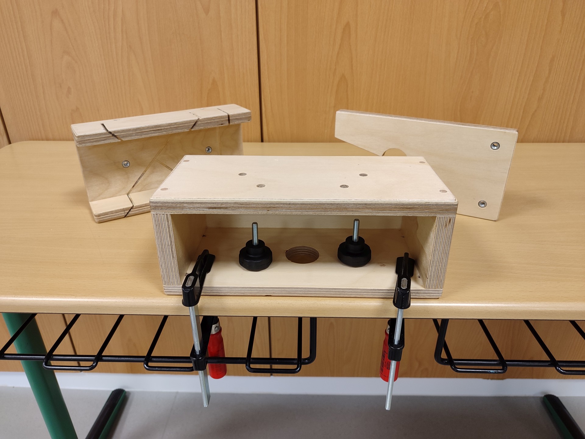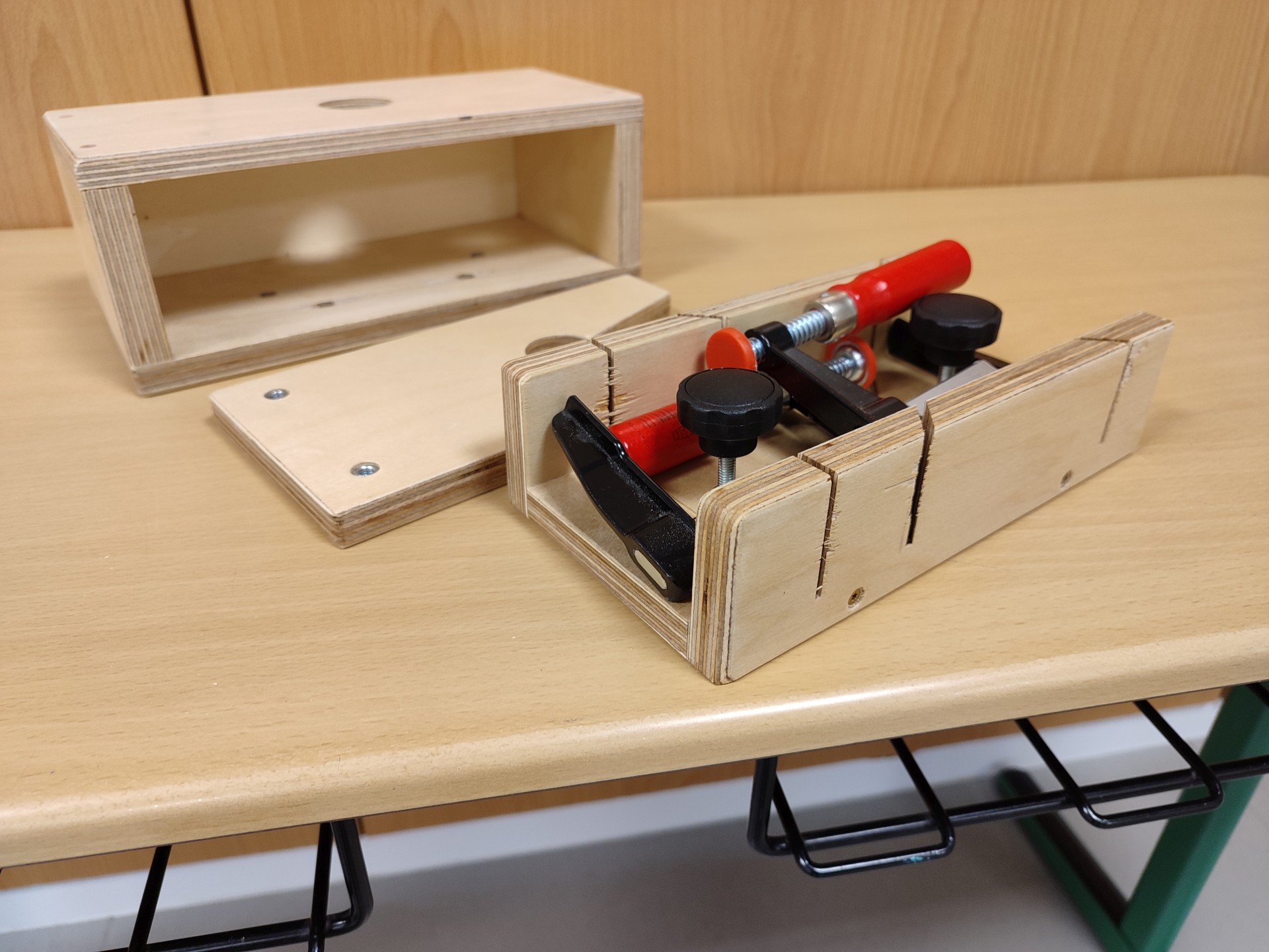 An déi éischt Normkëscht passe 6 Aarbechtsplazen, de Kär vun eisem "Workshop to go". All Aarbechtsplaz ka mat 2 Schraufzwénge sécher un der Bänk festgemaach ginn. Do drop gëtt entweder eng Gehrungslade oder e klengen Dësch fir mat der Lafsee ze schaffe geschrauft. Oder et kann een e Stéck Holz direkt mat enger zousätzlecher Schraufzwéng op der Aarbechtsplaz fixéiere fir drun ze schaffen. Wann ee fäerdeg ass, ginn d'Gehrungslade, de Lafsee-Dësch, d'Schrauwen an déi zwou Schraufzwéngen an der Aarbechtsplaz verstaut.